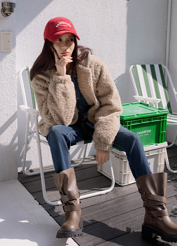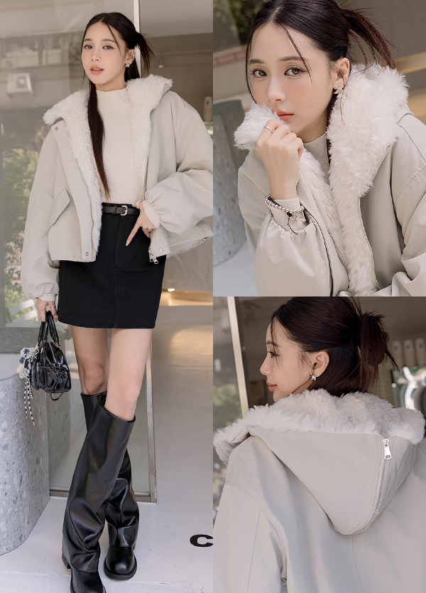 杏灰全鋪毛連帽外套