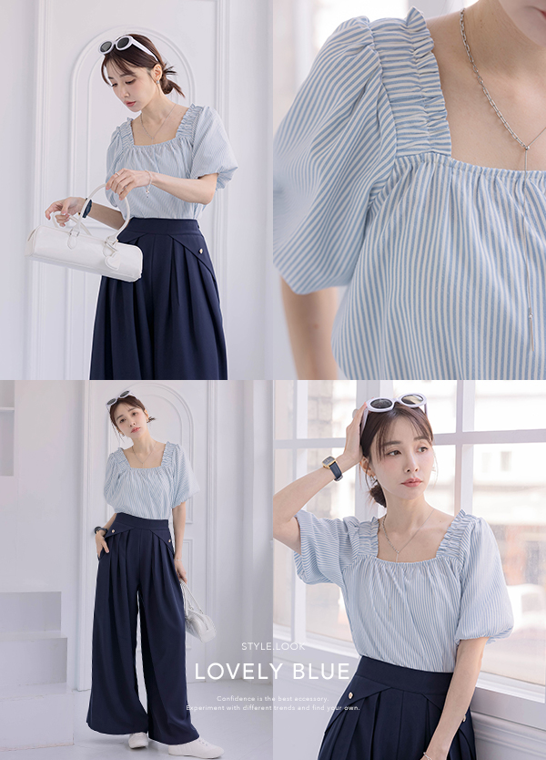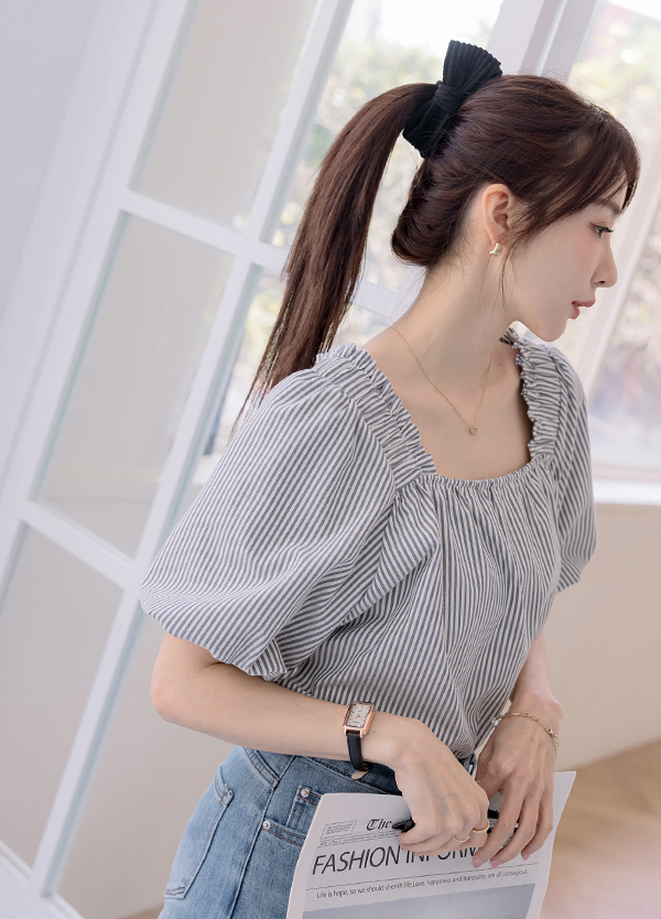 方領直紋泡袖上衣
