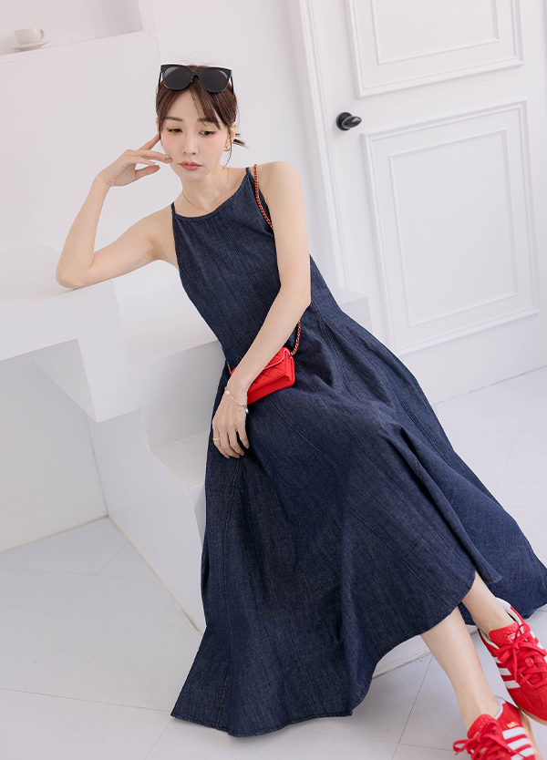 深藍削肩牛仔洋裝
